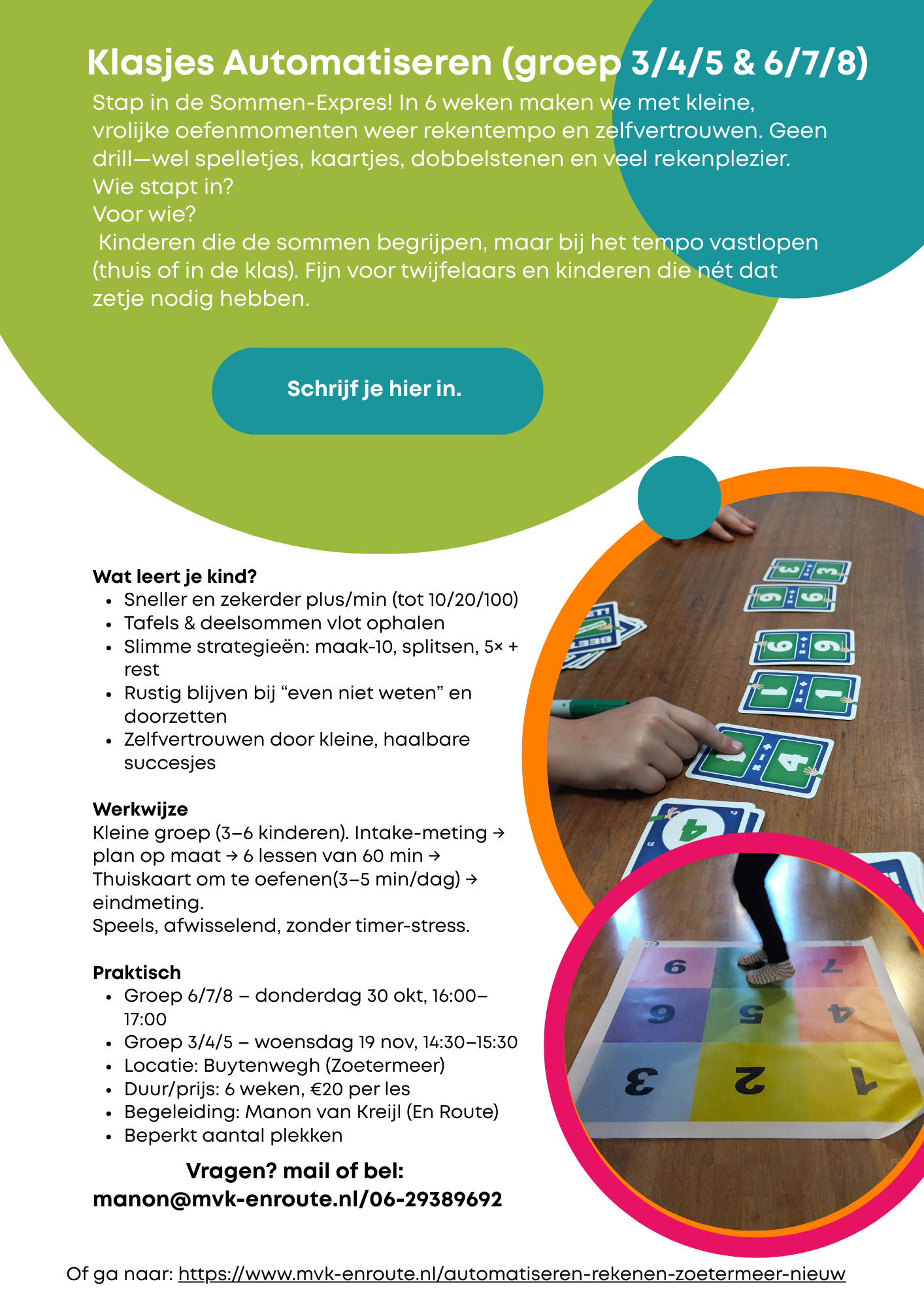 Zoetermeer – Diepenbrockrode 33 (Buytenwegh) · 3–6 kinderen · €20/les · 6 weken · speels oefenen met rekenplezier · zichtbare groei in tempo & zelfvertrouwen.