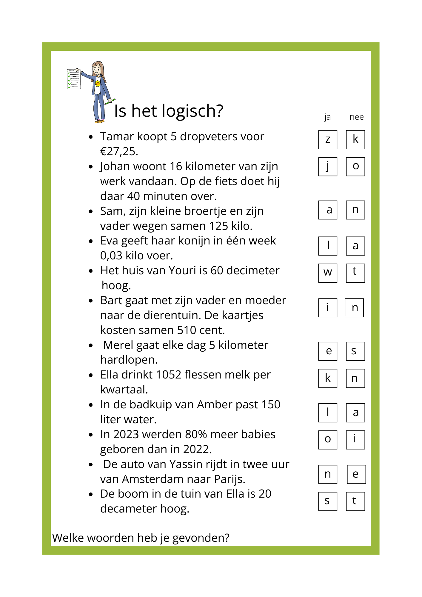 Met dit werkblad oefenen leerlingen niet het uitrekenen, maar het nadenken. Ze lezen korte situaties en bepalen of wat er staat logisch kan zijn.